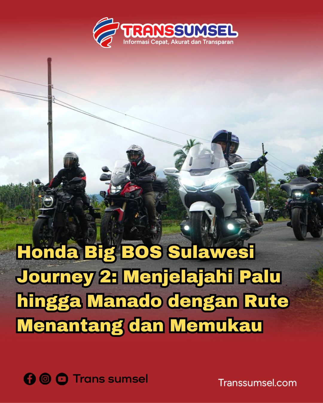 TRANSSUMSEL.COM Makassar – Honda Big BOS (Big Bike Owner Society) kembali melakukan touring Sulawesi Journey 2 bagi pecinta motor big bike Honda. Kali ini, jalur yang dipilih jauh lebih menantang dan mempesona karena menghadirkan jalur off road dan on road sepanjang kota Palu hingga Manado (09/09/2024).