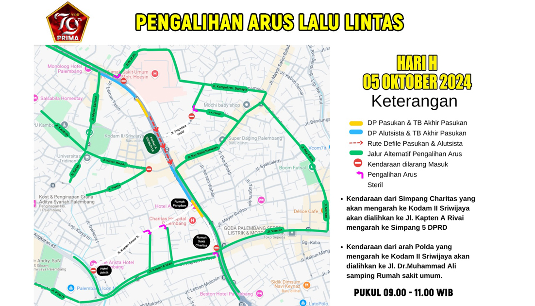 Transsumsel.com Palembang – Dalam rangka memperingati HUT Ke-79 TNI tahun 2024, sejumlah ruas jalan akan ditutup sementara selama beberapa jam.